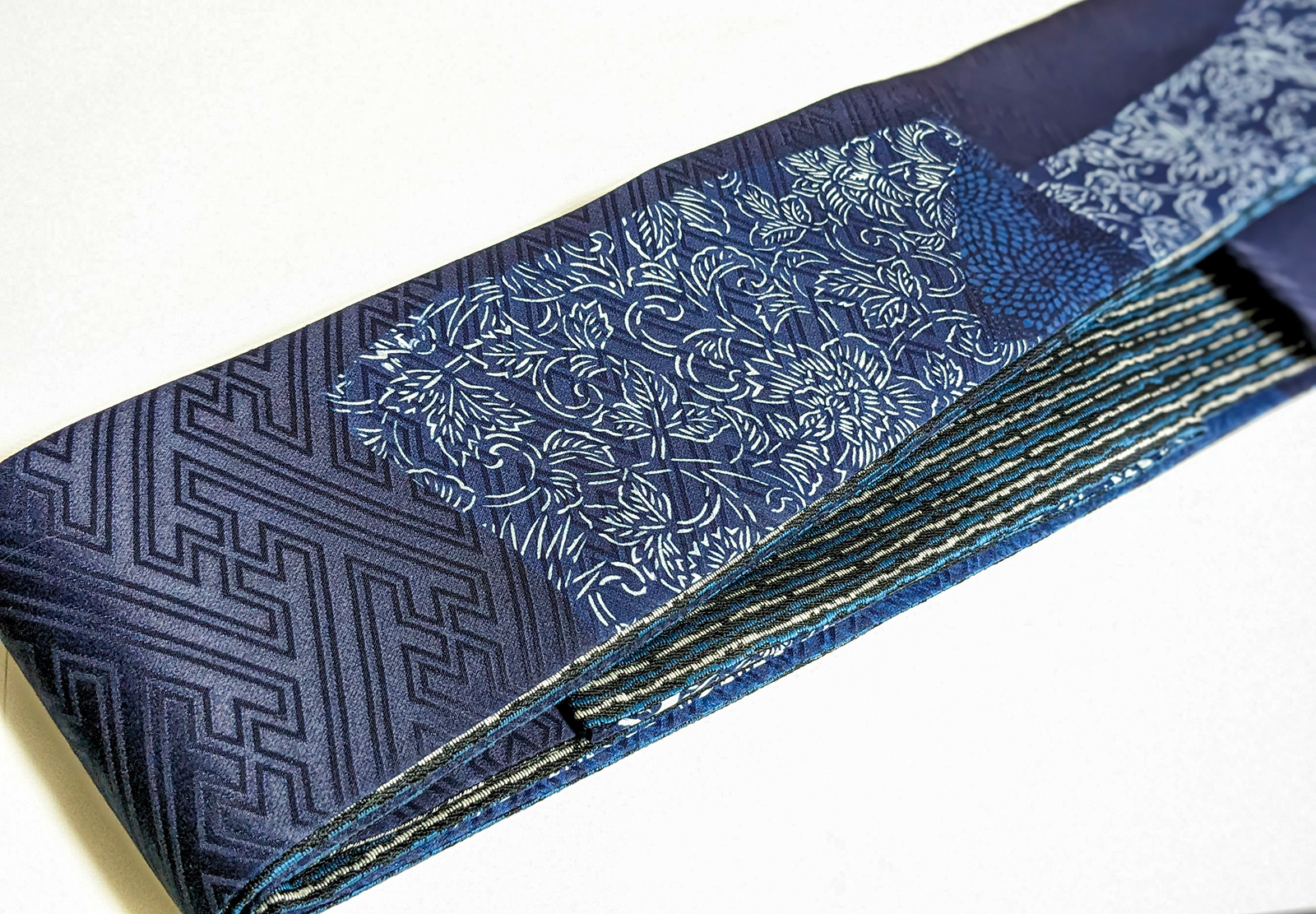 角帯は実際に締めてみると、藍の深い色合いが落ち着いた存在感を放ち、西陣織の裏地のおかげで締め心地も抜群です。「妻の振袖の一部を受け継いで、自分の装いに取り入れる」という体験は、単なるリメイクを超えた特別な意味を持つものになりました。